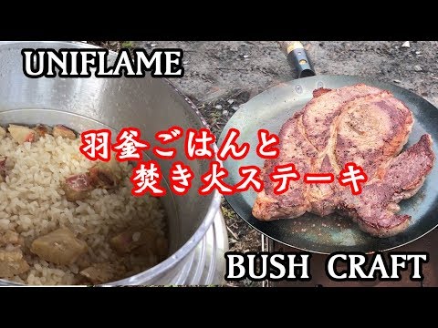 日常がキャンプ生活! というわけで、本日のお昼は、友人の前田さんといっしょにキャンプめし。 UNIFLAMEのキャンプ羽釜で炊き込みごはんを炊いて、BUSH CRAFTの焚き火フライパンでステーキを焼...